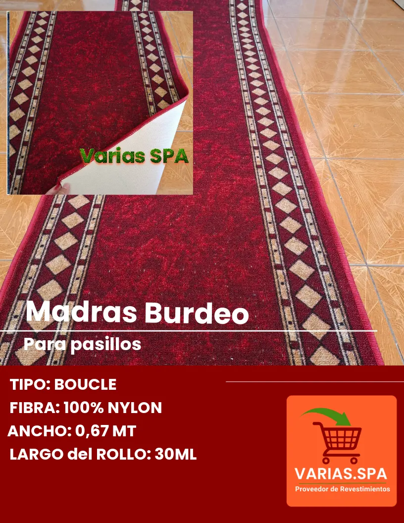 La Alfombra Pasillo Madras Burdeo – 67 cm está fabricada en nylon 100%, fibra reconocida por su durabilidad, excelente recuperación y resistencia a la abrasión. Integra base de goma antideslizante que mejora el agarre y la seguridad, especialmente en escaleras. Su tejido denso y color burdeo entregan presencia, ayudan al control acústico y mantienen el look prolijo pese al uso diario.