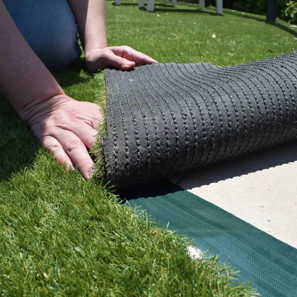 La cinta de unión elimina la necesidad de pegamentos adicionales y garantiza que los tramos de césped se mantengan en su lugar, evitando desplazamientos o aberturas con el tiempo. Esto asegura una instalación duradera y resistente, especialmente en zonas de alto tráfico o exposición al sol y la lluvia.