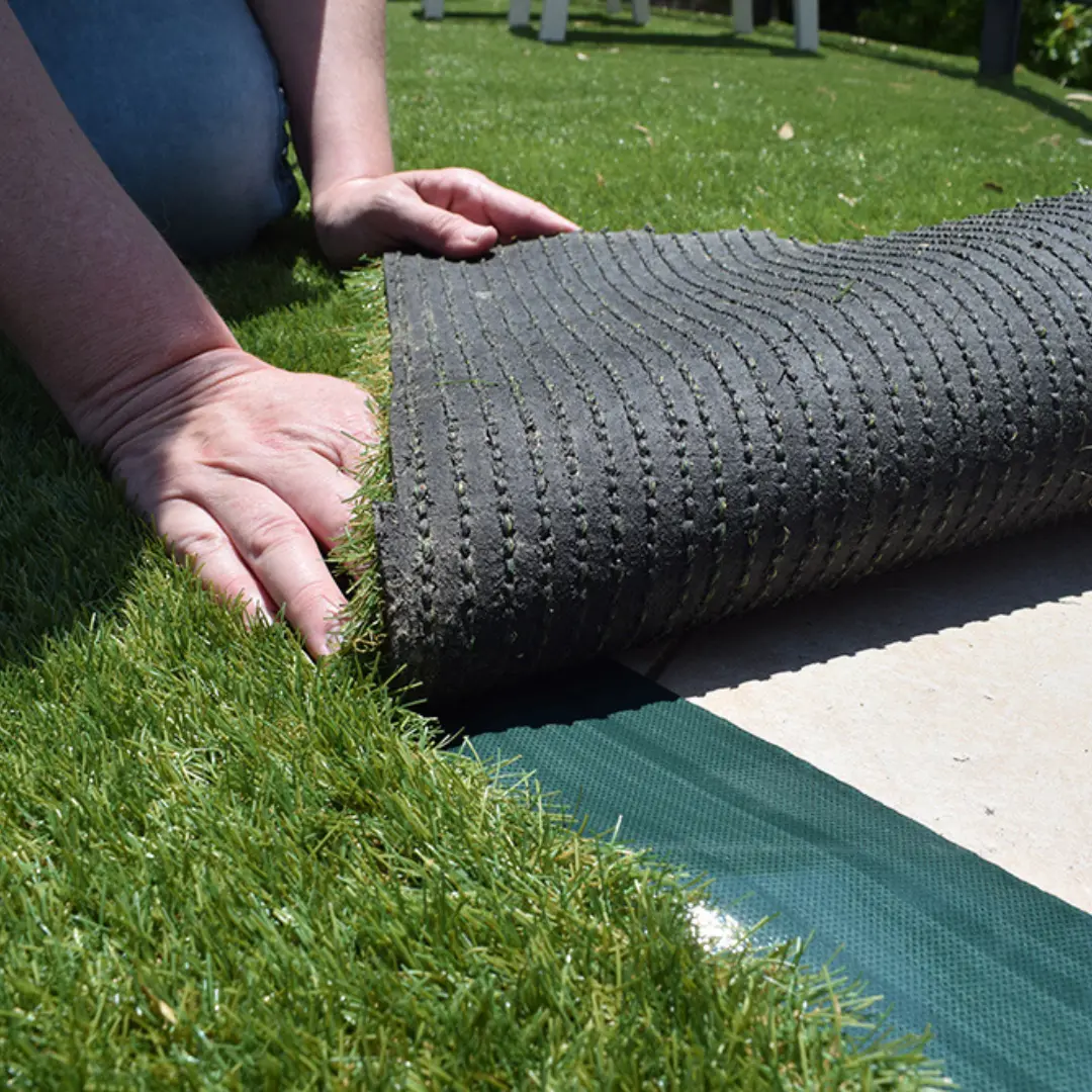 Desenrolla la cinta a lo largo de los bordes donde se unirán los tramos de pasto sintético. Asegúrate de que los bordes estén alineados y presiona firmemente para asegurar una adhesión completa. No requiere pegamento adicional, lo que facilita el proceso de instalación.